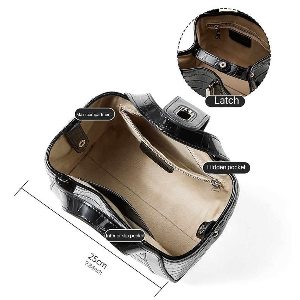 The Crocodile Pattern Compact Basket Style Handheld Crossbody Bag is crafted from premium genuine cowhide with an artful crocodile texture. Its classic bucket silhouette, medium hardness, and soft polyester‑cotton lining feel composed in hand and easy on shoulder. A secure latch and discreet interior zip keep essentials close—from workdays to weekends.