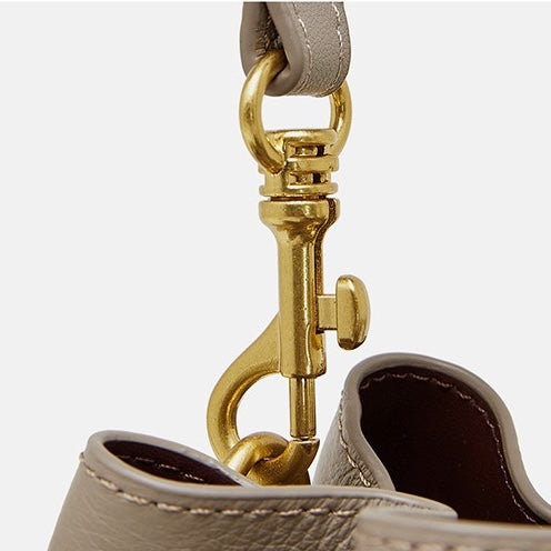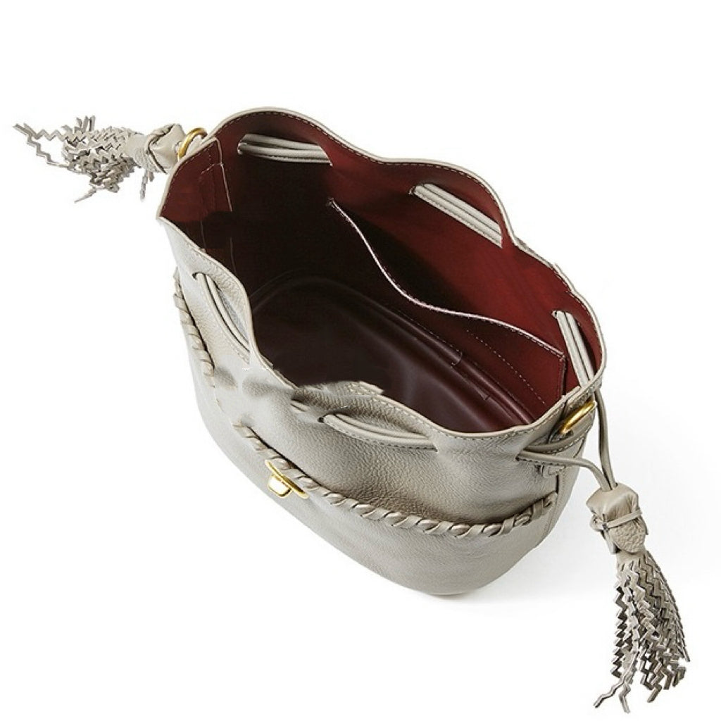 This medium-sized bucket bag, crafted from genuine top-grain cowhide, brings softly structured ease to every day. Fringe detailing and a drawstring closure with a discreet lock accent meet a fabric-lined interior with a zippered secret pocket—carry it by hand or crossbody; medium hardness keeps its shape without stiffness.