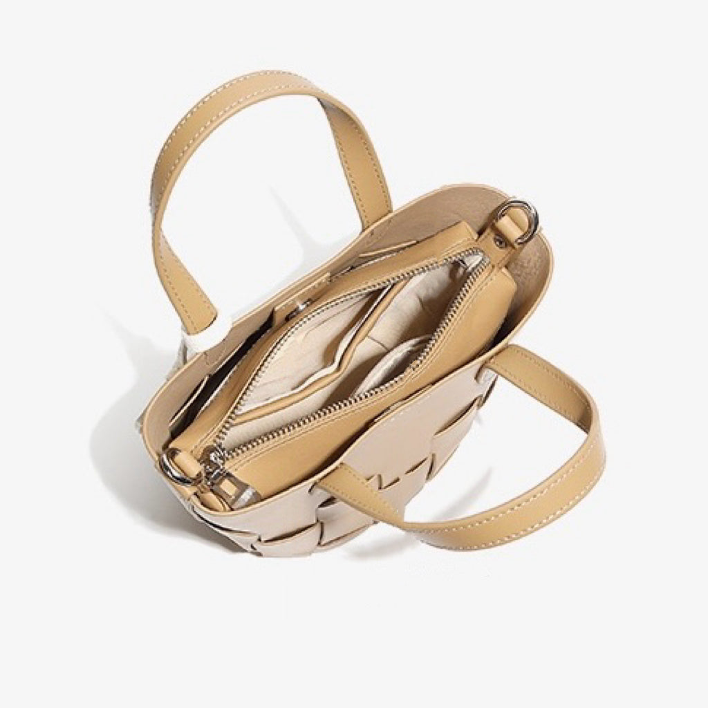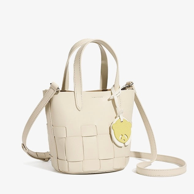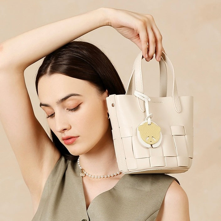 Handmade in genuine cowhide, this Women's Handmade Genuine Leather Woven Picnic Basket Bag With Cute Panda Charm moves easily from coffee runs to picnics and dinner plans. The woven bucket silhouette feels poised yet relaxed, with medium hardness that keeps its shape while yielding to your day. A smooth fabric lining and magnetic snap make every reach effortless, while the playful panda charm adds a discreet wink of joy.