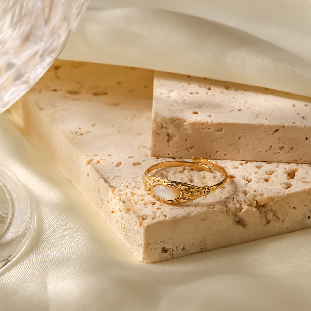 This geometric ring in stainless steel with zircon inlays brings polished structure to your days. It feels smooth and reassuring on the hand, catching light with a soft, modern sparkle. The open design adjusts with ease, moving from morning meetings to dinner with effortless grace.